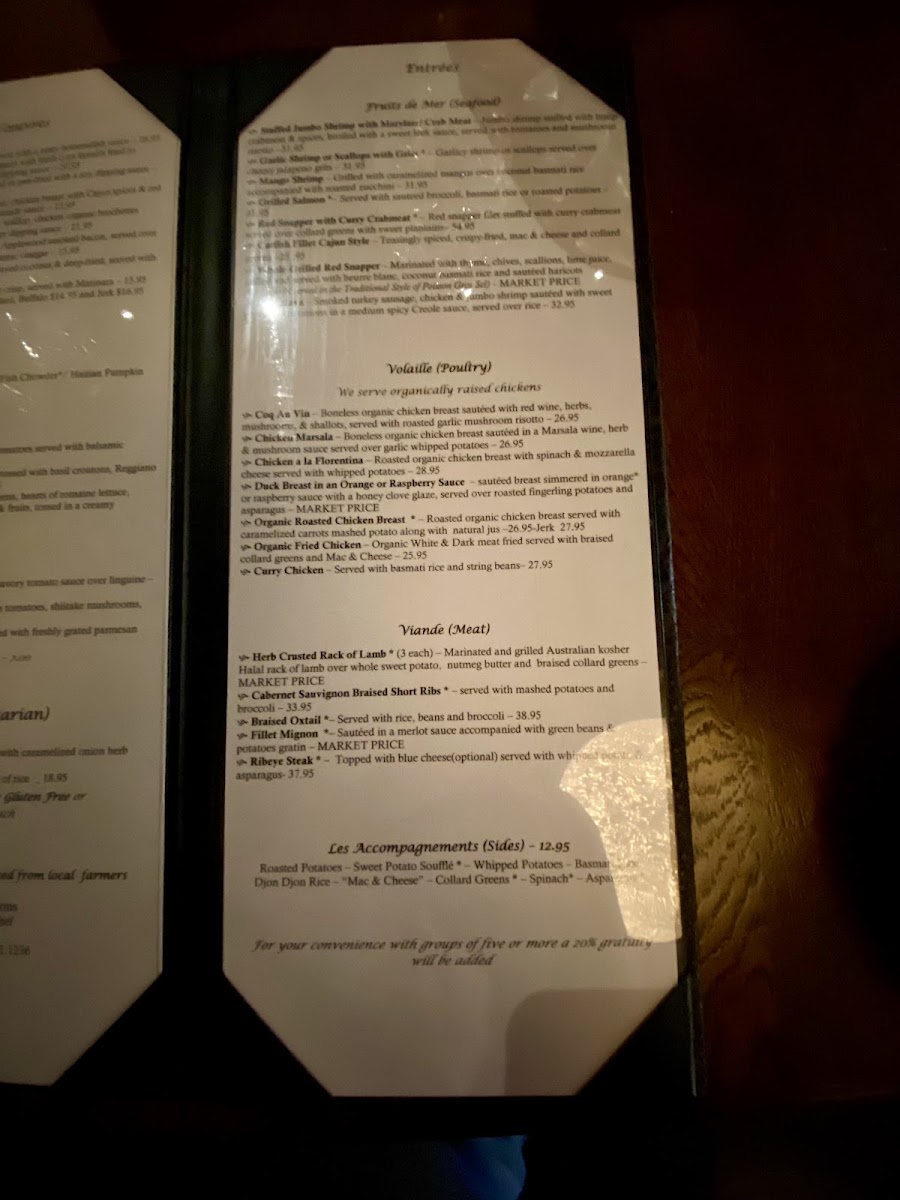 Roasted organic chicken breast served with caramelized carrots mashed potato along with natural jus | Jerk $$27.95